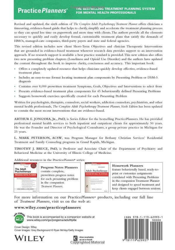 The Complete Adult Psychotherapy Treatment Planner 6th Edition is fully revised and updated to help clinicians simplify and speed up the treatment planning process. It provides a practical, evidence-based framework that supports effective clinical care. As a result, practitioners spend less time on paperwork and more time working directly with clients.